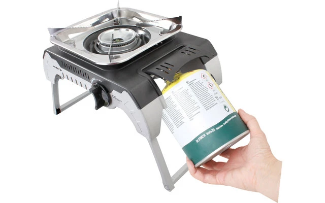 Tragbarer Gaskocher mit klappbaren Standbeinen aus Edelstahl. Betrieb mittels 450g Gewindekartuschen. Leicht, kompakt und einfach zu transportieren – ideal zum Campen oder Picknicken. Qualitativ hochwertige Konstruktion. Inklusive praktischem Kunststoffkoffer für den Transport.