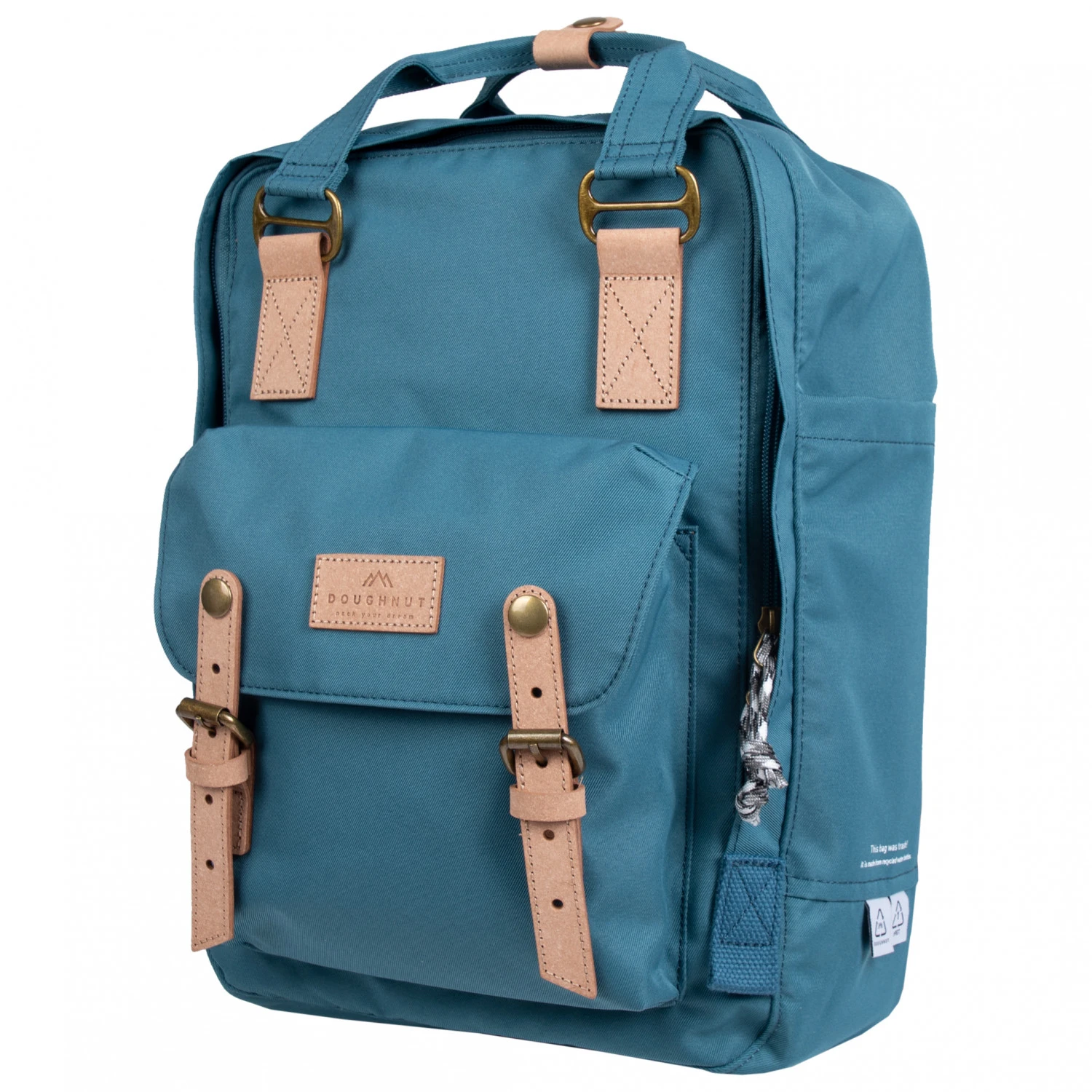 Für die Herstellung des Macaroon 16 Reborn Series Daypack setzt Doughnut voll auf Recycling. Das Hauptgewebe besteht aus 400D starkem Repreve Polyester Twill und auch alle anderen Applikationen und Details sind aus recyceltem Leder gefertigt. Mit einem großen Hauptfach, einem aufgesetzten Frontfach und einem 14 Zoll großen Notebookfach bietet der vielseitige Allrounder die richtigen Organisationsmöglichkeiten für Alltag und Freizeit. Für den täglichen Transport verfügt der Macaroon 16 Reborn Series Daypack über gepolsterte Schulterträger und einen komfortablen Tragegriff.